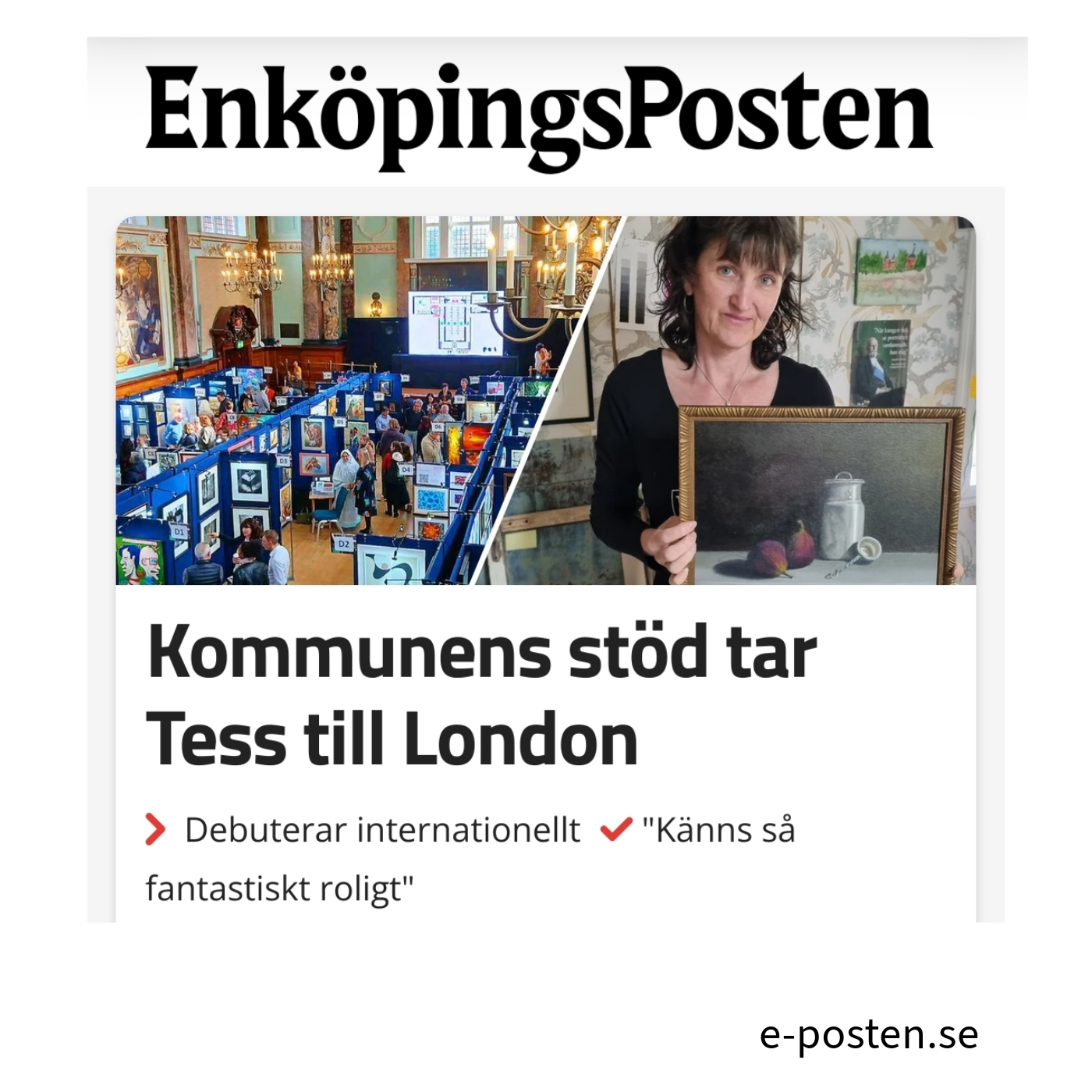 "För första gången ska Tess Enarsson pröva sina vingar utomlands. Efter att ha tilldelats kommunens kulturstöd är siktet inställt på London." skriver Enköpingsposten.