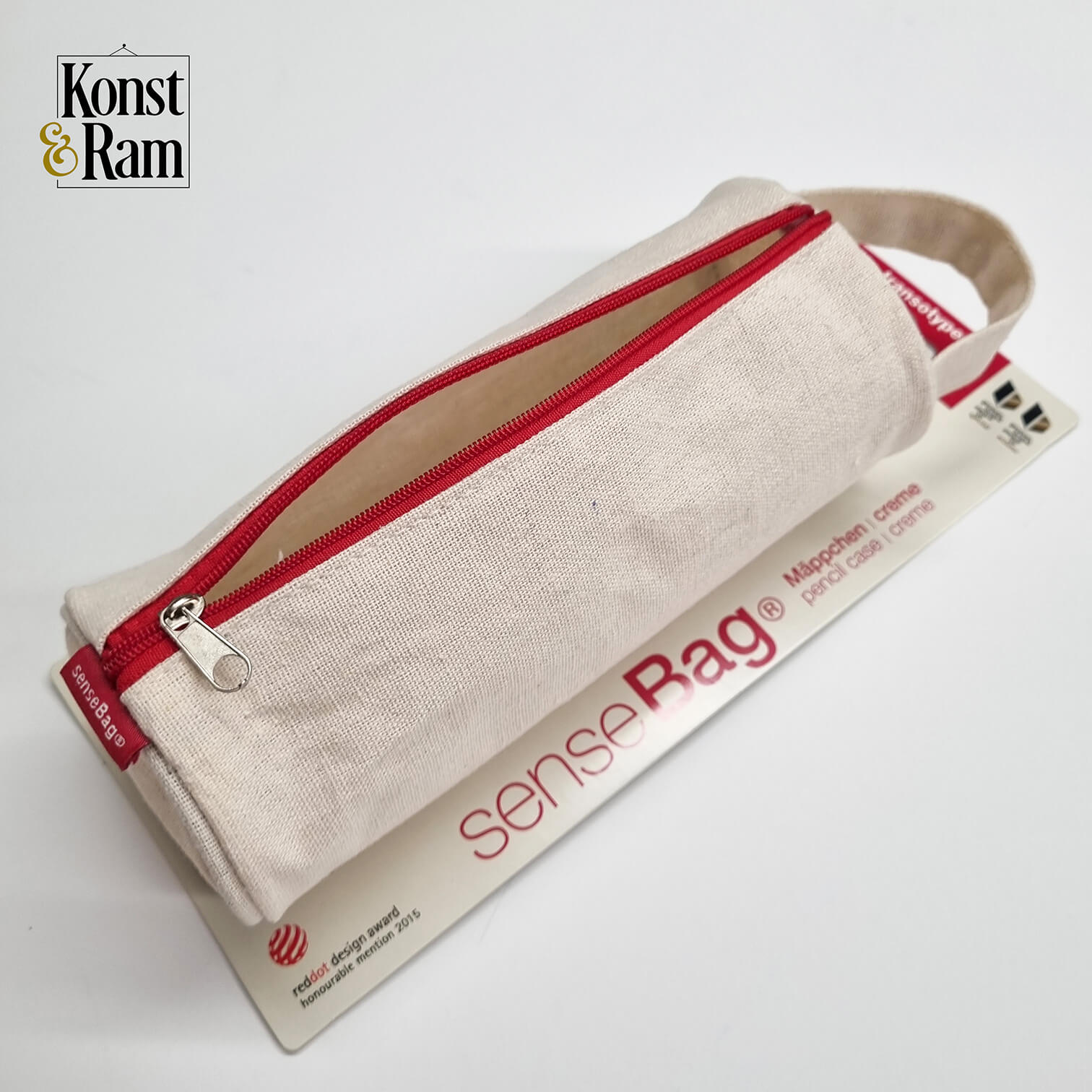 Cylindrical pencil case made of natural-colored linen with red details and zipper.