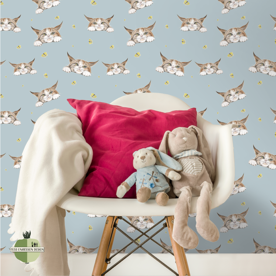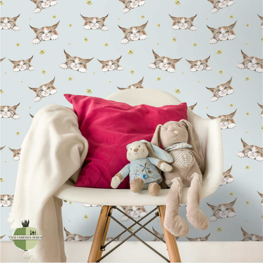 The mischievous wallpaper Kattsmyg leaves no one indifferent. With its mischievous eyes it looks around and watches for small yellow butterflies. Kattsmyg is also available as other products. Available in four colors, white, light blue, light pink and warm blue.