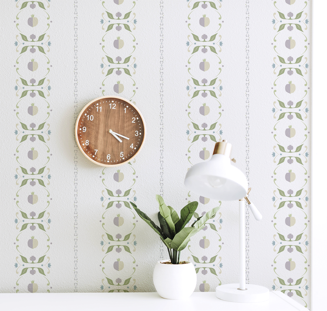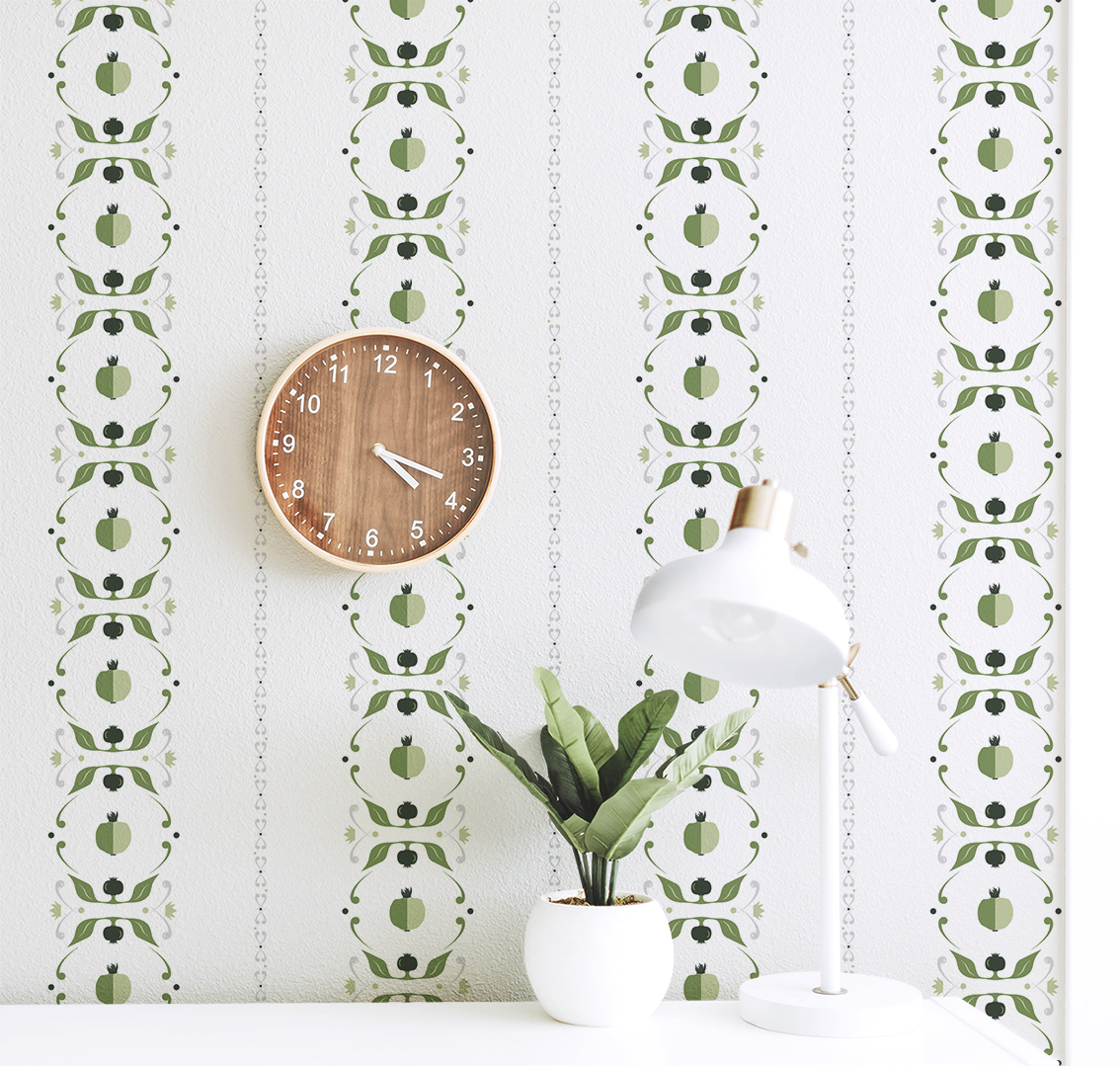 Sweet Pomegranate Classic in a classic vertical repeating design in a modern vintage with the exotic fruit pomegranate in two-tone tones. Soft lines and small details. Available in six beautiful colors. The wallpaper is smooth.