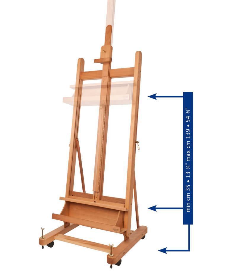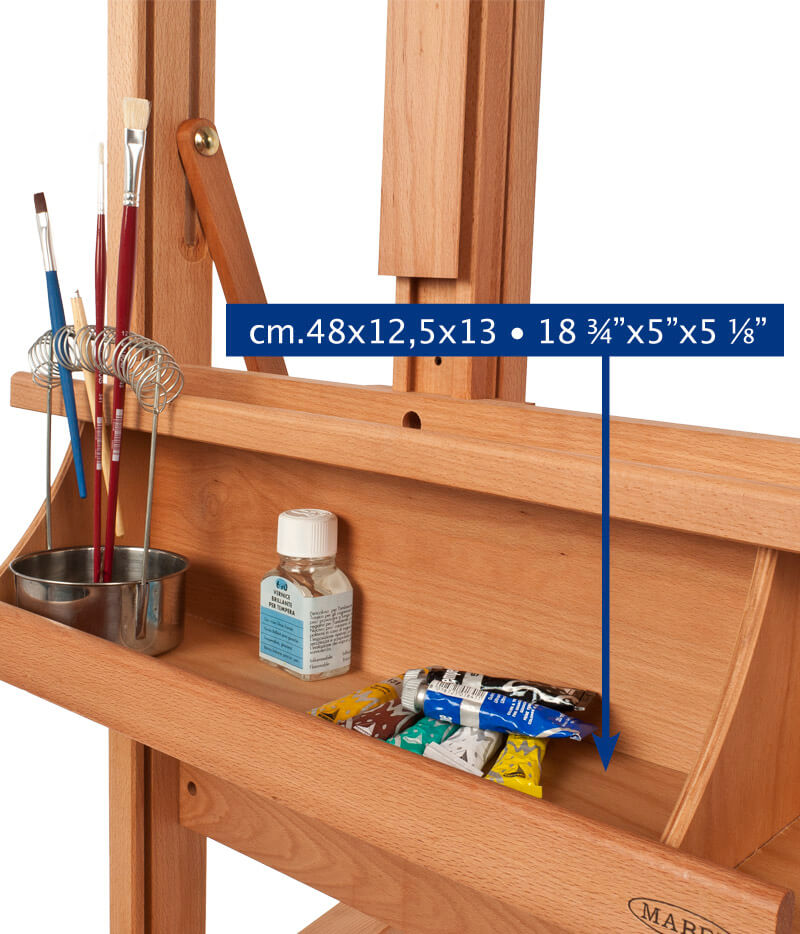 Ateljéstaffli för stora dukar i fläckresistent oljad bok från det italienska kvalitetsmärket Mabef. Robust och praktiskt kvalitetsstaffli med tilt både bakåt och framåt för bästa vinkel. Öppen stora låda under tavellisten för förvaring av färger och rittillbehör. Perfekt för dukar och ritplattor för olja, akryl, pastell och teckning.