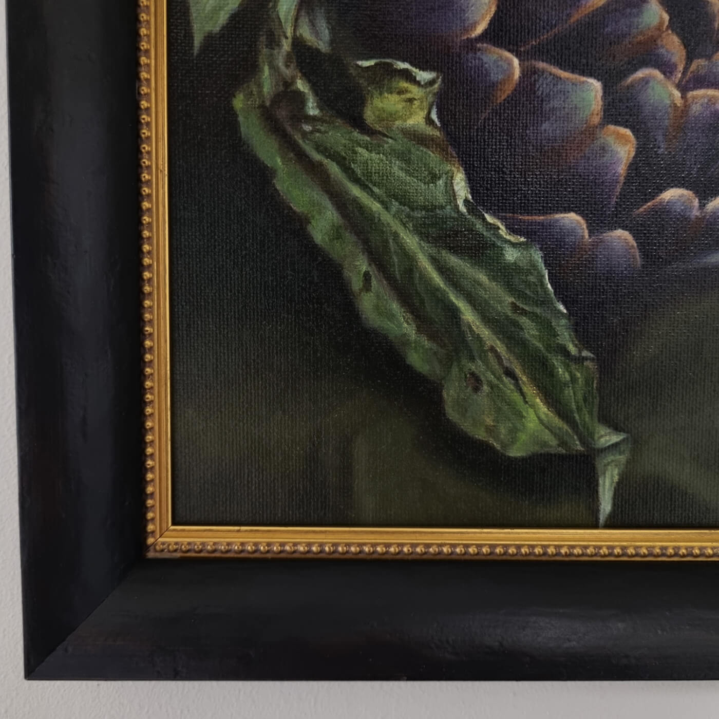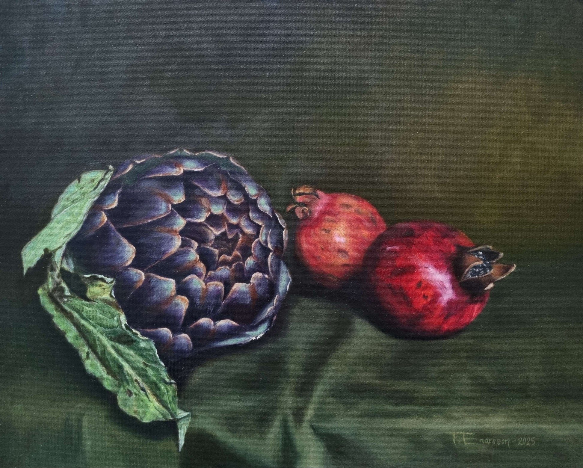 Stilleben 'Kronärtskocka med granatäpplen' av Tess Enarsson, inramad originalkonst i olja.