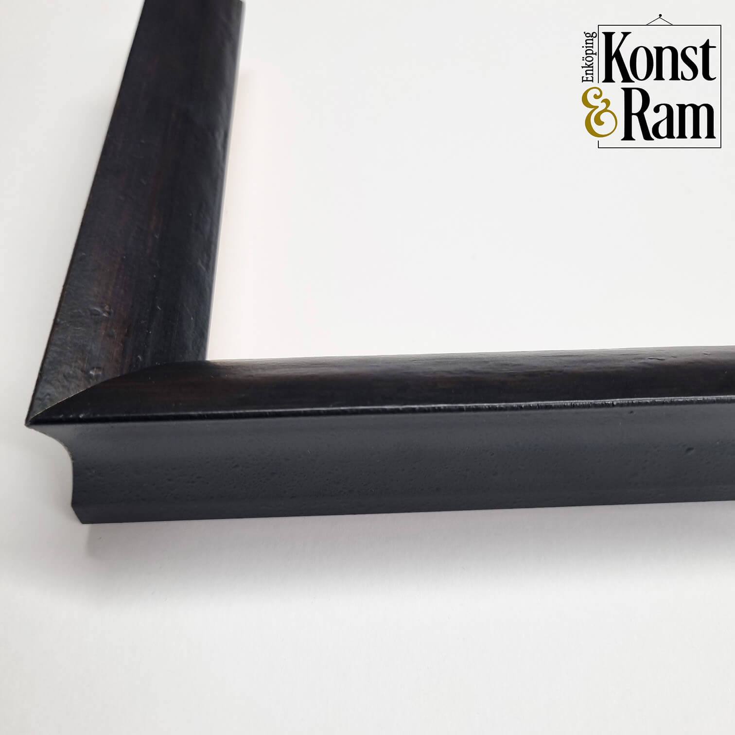 Ramad i en mörkt brun fururam med innerkant i varmguld med pärlrad. Ramen är hög och har midja i sidan.
