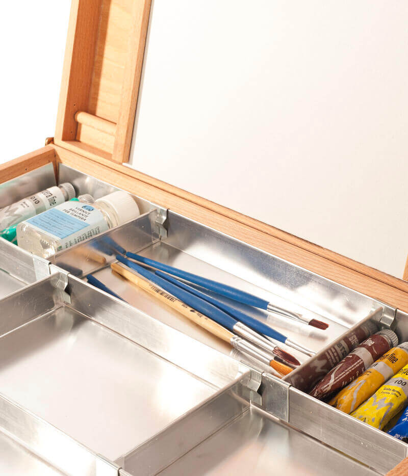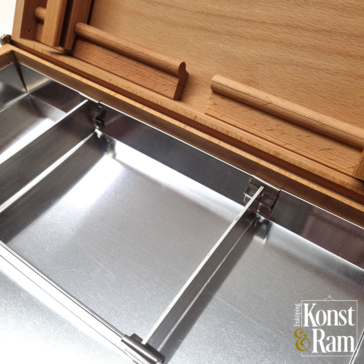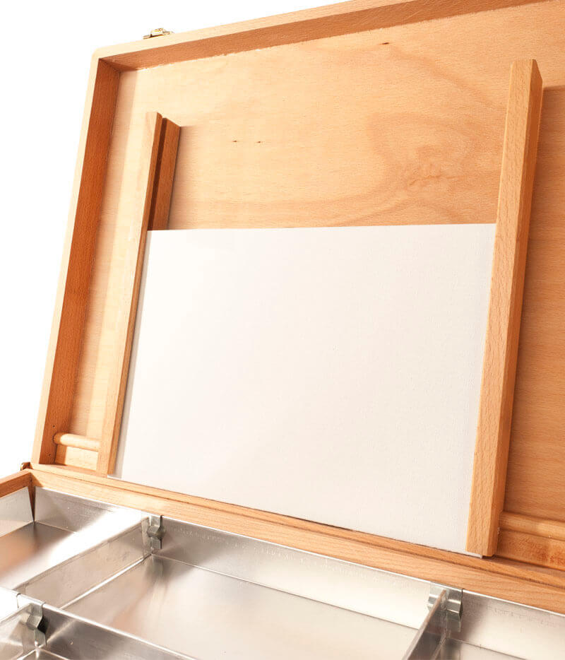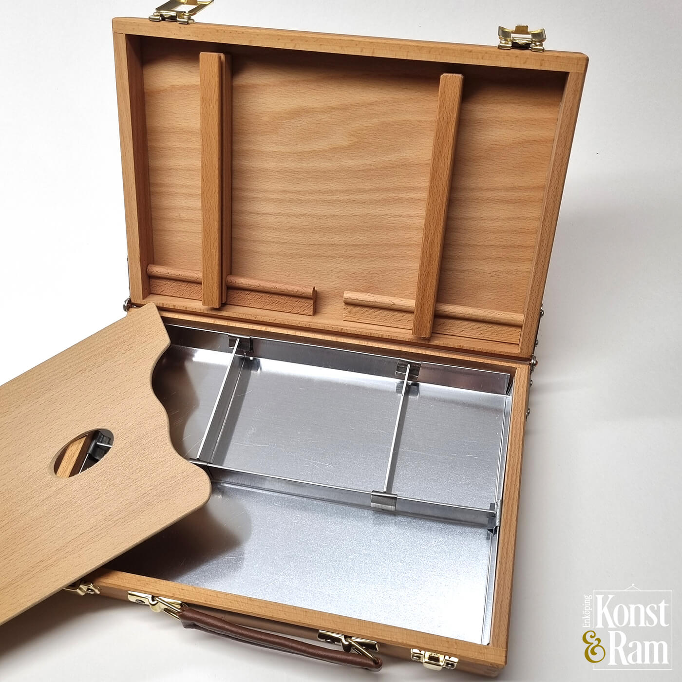 Bärbar målarbox/staffli med palett och reglerbara metallfack för färger, penslar och medium. Skjutbara hållare för dukpannå eller canvas i locket. Handtag i läder för att enkelt bära med sig. Träpalett ingår.