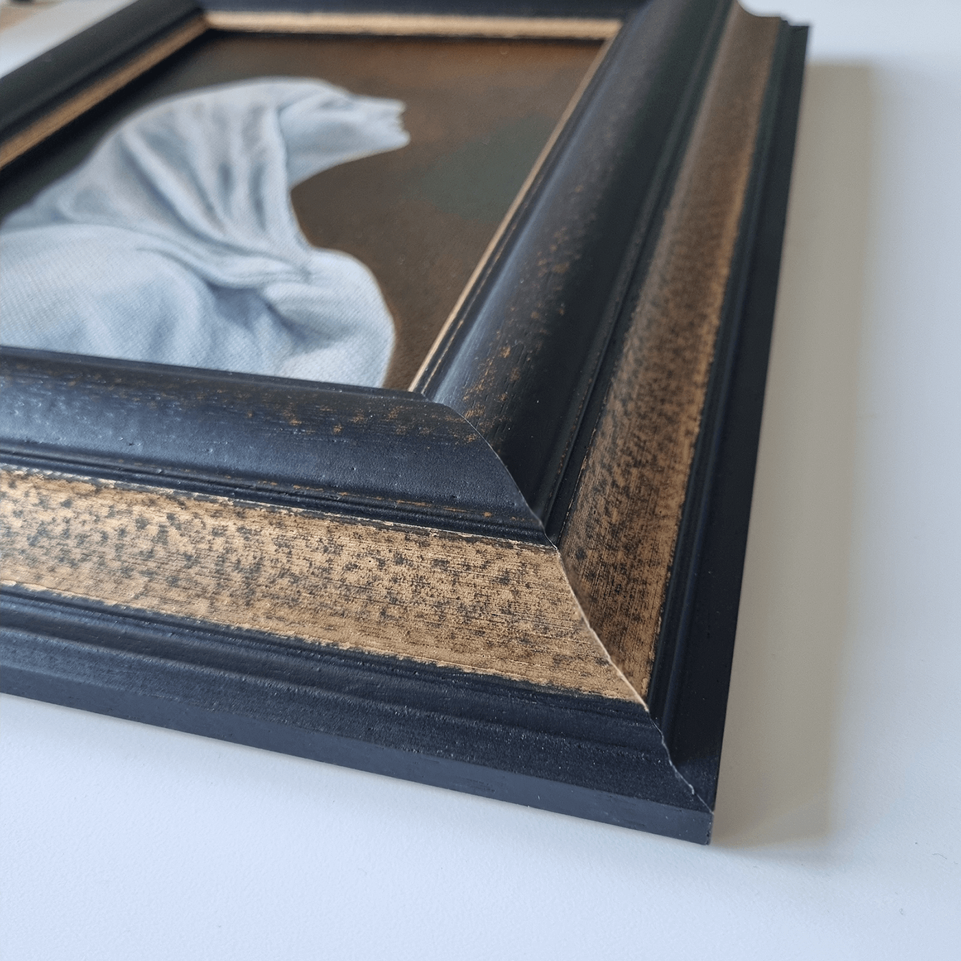 Ramad i en bred gammeldags träram i svart och guld av Enköping Konst & Ram. Upphängning vire. Monterade kilar med ståltråd.
